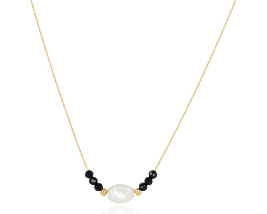 Elegancja i harmonia – naszyjnik z perłą rzeczną i onyksem to połączenie dwóch wyjątkowych kamieni, które razem tworzą ponadczasowy, klasyczny design. Perła rzeczna, symbolizująca czystość i mądrość, doskonale kontrastuje z głęboką czernią onyksu, który dodaje mocy i pewności siebie.